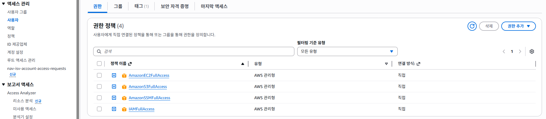 AWS에 로그인하고 kestra 리소스에서 활용하는 사용자를 [ IAM > 사용자 ] 에서 찾아 IAMFullAccess 권한을 추가 해줬다.