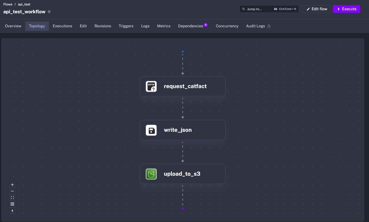 아까 만들었던 api_test_workflow 플로우에 적용하기 위해 [ Flows > api_test_workflow > Edit ] 경로로 들어가서 Flow Code 창에 task를 다음과 같이 추가 해준다.