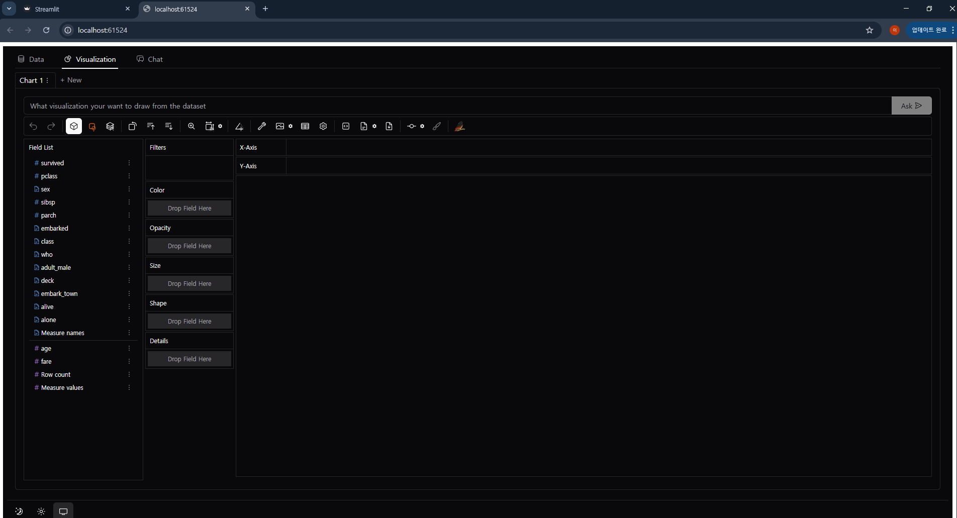 실행해보면 다음과 같이 2개의 브라우저 창이 열리면서 하나의 창에는 Title만 작성된 Streamlit 화면, 하나의 창에는 PyGWalker 화면이 띄워진다.