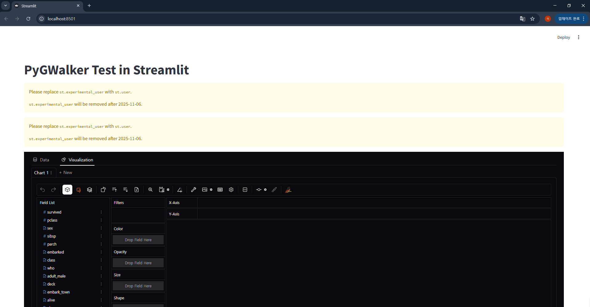 이렇게 하면 한 화면에서 Streamlit과 PyGWalker를 함께 사용할 수 있지만 현재는 다음과 같은 알림이 뜬다.