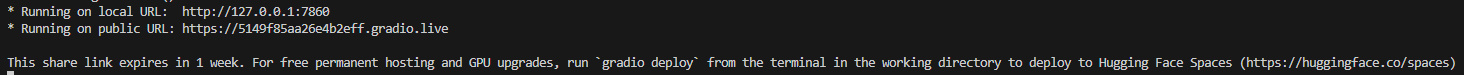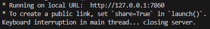 gradio로 작성된 화면을 실행하면 다음과 같이 실행되며 실행된 로컬 머신에서 http://127.0.0.1:7860 주소로 접속할 수 있다.
