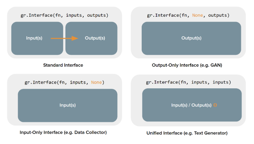 gradio에서 Interface 기능을 활용하면 위와 같은 4종류의 인풋 아웃풋 폼을 간단하게 생성할 수 있다.